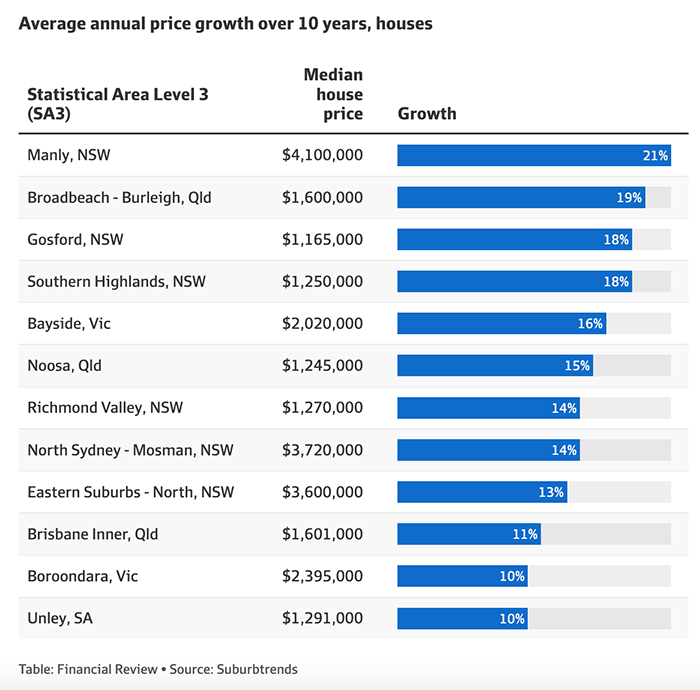 阳光海岸的Noosa在过去10年里获得了14.7%的房价年均增长率,而新南威尔士州的Southern Highlands则录得了17.8%的年均增长率。