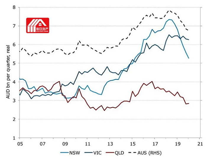 新州在全澳数据中占比很大,季度降幅 8.1%,年度降幅 17.3%,因为其受夏季山火和疫情影响最为严重。