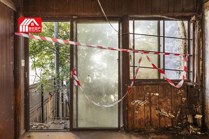 有着五到六间卧室的房屋横跨四个楼层,整个房屋潮湿不堪,地板腐烂,天花板掉下,阳台塌陷。