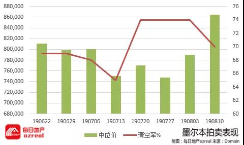 我们再来看墨尔本,最近八周,清空率在起伏中向上突破又回调。最近八周均录得60%以上,其中最近四周均超越70%。在连续三周74%的清空率之后,8月10日稍微回落,为70%。